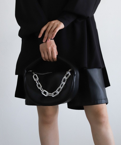 ーーー 休日に使える女性らしさ満載のアーチ型バッグ。 長財布が入る幅で、ポーチや小物も入るサイズ感に仕上げました。 ーーー 今年らしいトレンドのビッグチェーンがポイント。 アクセサリー感覚で使用でき、コーディネートのアクセントに。 ソフトレザーを使用し、かっちりとなり過ぎない素材感で、 持つだけで抜け感が出せるアイテムです。 丸みのあるフォルムのため、身に着けるだけで女性らしい印象に。 ビッグチェーンは取り外し可能なため、 その日の気分に合わせて表情を変えられます。 シンプルなコーディネートにもアクセサリー感覚で取り入れられおすすめです。 ※撮影環境により、光の当たり具合で 色味が違って見える場合があります。 あらかじめご了承下さい。