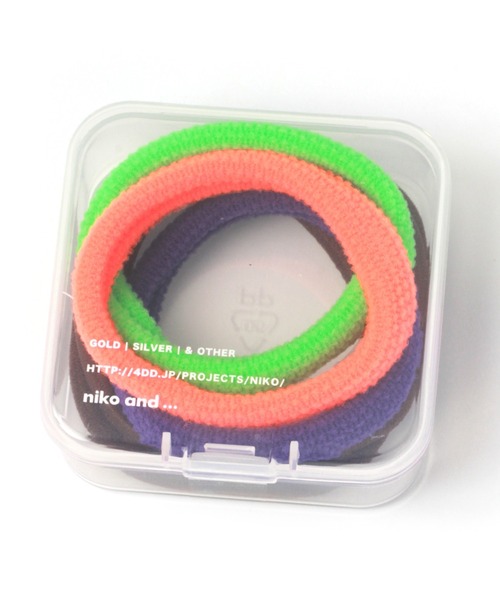 ケースも可愛いniko and ...オリジナルヘアアクセ ニコロゴ入りのクリアケースに、カラフルなヘアゴムが入ったセットアイテム。 髪の毛を結ぶのはもちろん、手首につけても◎ 付けるだけで一気に華やかな印象になること間違いなしです。 ●6色×6本入り