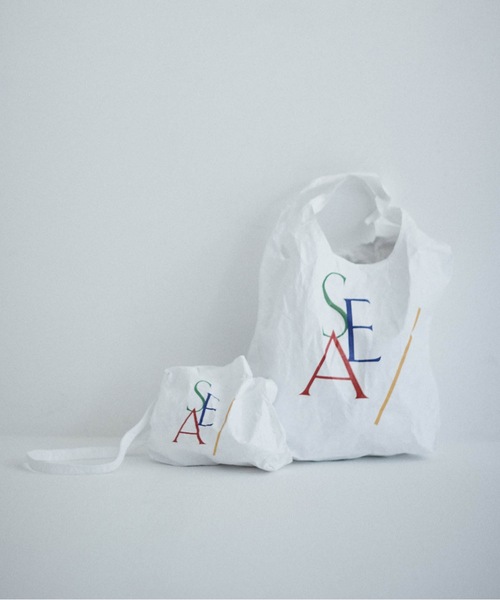シートポリエチレン素材で、0.5~10ミクロンのポリエチレンの極細長繊維をランダムに積層し、熱と圧力だけで結合させた独自の構造により、優れた透湿・防水性能を有し、抜群の強度と耐久性能を保持することが可能な素材。登山やキャンプ用品などにもよく使われていますが、一般的には建築資材として使用されていることが多く、軽量なので、スーパーでのお買い物のお供にもぴったりです。肩から斜めにかけることのできるお散歩やちょっとしたお出かけに便利なショルダーバッグとお買い物にも便利なマルシェトートの2サイズ展開。今期のロゴグラフィックプリントを施しました。マルシェトートには内ポケットも付いているので小さく畳んでコンパクトにすることも可能です。