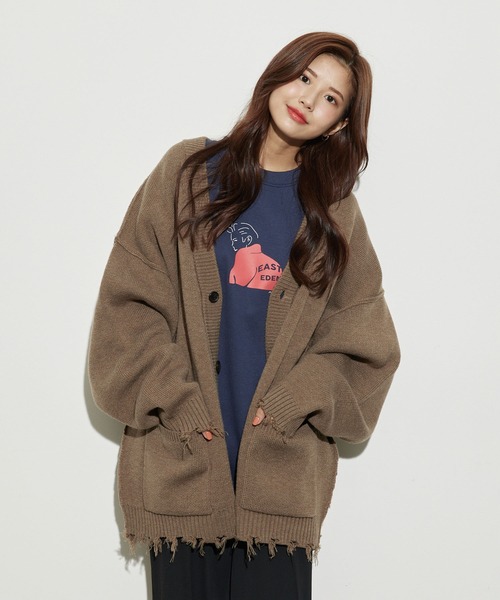 【 マルチに着回せる万能カーデ 】ダメージニットルーズカーディガン ■素材、機能 肉厚の編み地にても重すぎない糸を使用し軽さを出した素材です。 手触りもチクチク感は無く、気持ちよく着用できます。ボリューム感のあるバルキーニットで保温性も抜群です。 ■シルエット、デザイン ドロップショルダー、ワイドスリーブでルーズなサイズ感でトレンドライクなシルエットに仕上げています。 袖口、身頃裾にダメージ加工を入れ、一枚でも決まるアクセントになっています。 縫代を表出し表面変化をつけ、シンプルの中にもこだわりが詰まっています。 ■カラー くすみカラーを含めた3色展開です。単品でも決まる独特のグリーンは新しいスタイリングのアクセントになります。 ■スタイリング フェイクレザーパンツや、ワイドパンツに合わせたモードなスタイリングや、トーンを合わせたゆるくした抜け感コーデもおすすめです。 シンプルなデザイン感なのでアウターのインナーでも一枚でも決まります。 裏地:なし 透け感:なし 伸縮性:あり 生地感・厚さ:厚手 ポケット:あり その他仕様:なし 【モデル情報】 MEN:身長177cm 着用サイズL WOMEN:身長164cm 着用サイズL