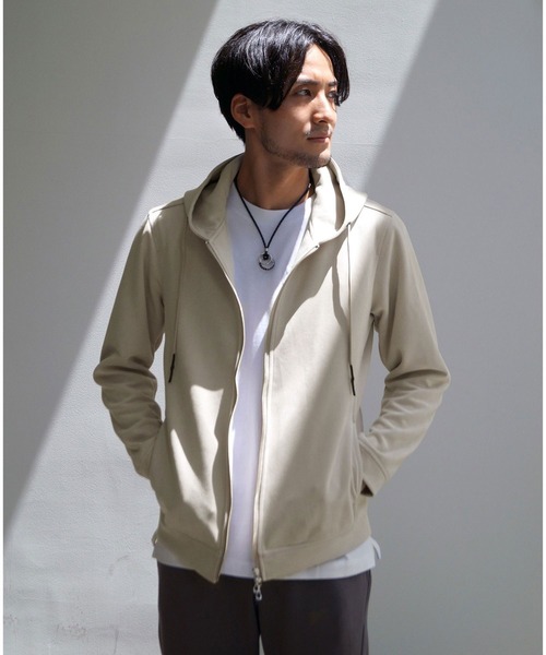 ポリエステルのマイクロファイバーで織られたカットソーのポンチ生地をスウェード起毛したの素材の軽量版です。キメの細かいスウェード調起毛によって滑らかなタッチ感と光沢感があり、ジャージ素材なので良く伸びてヨコ張り感もあるので綺麗なシルエットを作ります。ベーシックなジップアップパーカーデザイン。少しウエストシェイプを入れた程好いサイズ感で素材のドレープ感を残したシルエットに仕上げています。更に製品で撥水加工を施して軽い雨や汚れを防ぐ効果をプラス。※撥水加工は素材の特性上、染み込み難い程度の撥水効果で、かつ永久ではありません。衣料用のデータに基づいた効果で、例えますと水がかかり、手で払ったら細かい滴状の湿潤が残る程度の効果になります。