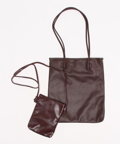 スマホショルダーがセットになったトートバッグ。マチのないスリムなタイプなのですっきりと持ち運びが可能。内ポケット付きなので、小物もバラつかずに整理することが出来ます。シックなカラーでコーディネートにも品良く馴染み、カジュアルから綺麗めコーデにと、幅広く活躍してくれるアイテムです。
