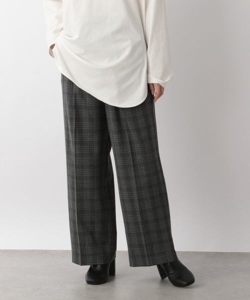 シルエットはワイド過ぎないスラックスパンツでウエストにタックのタックとセンタープレスで脚長効果もあるメンズライクなパンツ TR(ポリエステルとレーヨン)のブレンド糸を先染めで織る事で膨らみのある滑らかな表面感に生地に仕上げています。 杢糸という1本の糸の中に複数の色が混ざっている糸を使用している部分は見た目にも奥行きが出て雰囲気のある素材感が感じられます。 無地のグレーはTRですが表面がふわふわと毛羽立って見えように工夫し、トレンド感のあるパンツになっています。 スウェットなどのカジュアルなトップスと合わせてメンズライクなスタイリングがオススメです♪