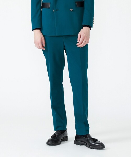 上品な光沢があり、高級感のあるギャバ生地を使用した、タックトラウザーズ。 ポリウレタン混なので、ストレッチ性もあり、ストレスフリーに着用頂けるトラウザーです。 適度なタックを入れ、裾口に向けて細くしているので、サイズコンシャスにコーディネートを楽しんで頂けます。 オリジナルのメタルボタンやマーベルトを使用したオリジナル性の高い一品。 同素材のジャケット(品番:65D34-601)を揃えておけばセットアップでの着用が可能。それぞれ単体での着用も可能なのでコーディネートの幅が広がります。