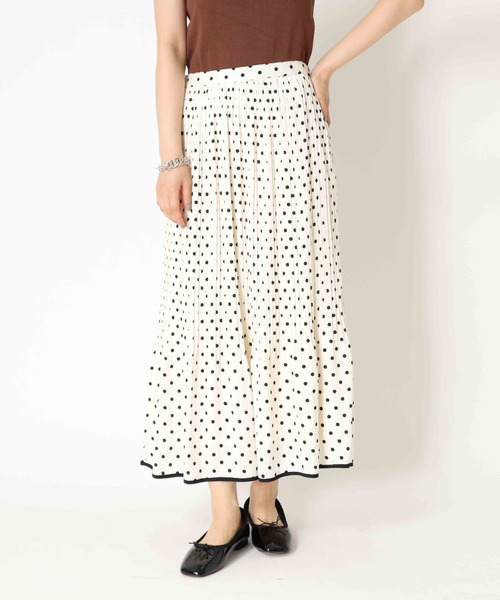 ドットプリントプリーツスカート歩く度ふんわり広がるプリーツスカート。存在感のあるドット柄が可愛らしい印象にしてくれる1枚です。裾にラインを入れることで、引き締め効果と甘さをおさえてくれるデザイン。大人でも取り入れやすい、ドット柄のスカートです。