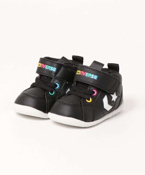 不安定なベビーの足元をやさしくサポートするベビー向けミッドカットモデル。シンプルなモノトーンカラーのアッパーに、可愛らしいカラフルなカラーアクセントあしらったキュートなデザイン。アッパーにはソフトなシンセティックレザーを採用し、歩き始めのベビーの足を優しくサポート。靴底は、裸足感覚を体感できる薄めのアウトソール設計。軽量で屈曲性がよい仕様で健やかな足の成長を促進します。ワンタッチで脱ぎ履きさせやすいワンベルトデザイン。【スペック】・足先を自由に動かせるゆったりとしたルーミーラスト・持ちやすく、脱ぎ履きさせやすいビッグタブ・タンが大きく開き、脱ぎ履きしやすい設計・取り外し可能な抗菌カップインソール・足の曲がる位置でしっかり屈曲するソール設計