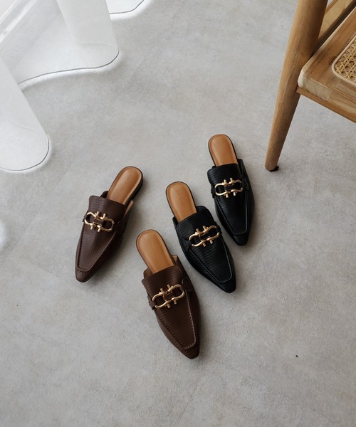 ビットデザインがポイントのバブーシュ 秋口のスタイリングには、シンプルなパンツスタイルに、素足でさらっと合わせていただくのがおすすめ。フェミニンなスカートスタイルには、秋のムードを高める外しアイテムとして◎ つま先の細いスクエアもポイント。足元をクールに演出してくれます。