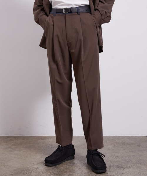 【 撥水・イージーケア 】バイシクルワンタックイージーパンツ ■素材、機能 滑らかでしっとりした肌触りで上質な生地になります。 体にまとわりつく感じも無くストレッチ性も高いのでストレスフリーで着用可能な素材になります。 撥水加工も加え軽い雨、汚れを弾きシワにもなりにくくイージーケアなアイテムになります。 ■シルエット、デザイン 自転車に乗った際にもポケットが使いやすいようにバックポケットは脇に移動させ携帯、財布などの小物が体に接触しにくくなっています。 ワンタックのリラックしたシルエットにし、腰回りにゆとりを持たせ生活に必要な動きの妨げをしません。 ウエストベルトをカラー配色しタックインなど見せるコーデに最適です。さり気ないカラーリングがアクセントになります。 また、ウエストの内側に調節紐をつけ、バックにはシャーリング仕様でストレスフリーな機能性を持たせています。 セットアップで着用可能な同素材のシャツ、ブルゾンもご用意しております。 ■カラー 落ち着きがあり深みのあるカラーリングのモカ、ブラウン、グリーン、ブラック、ベージュチェックの5色展開。 ■スタイリング ダンボールパーカーに合わせリラックスした綺麗めコーデも両方楽しめます。 また、同素材のシャツ、ブルゾンと合わせた硬すぎないセットUPでコーデもおすすめです。 裏地:なし 透け感:なし 伸縮性:あり 生地感・厚さ:普通 ポケット:あり その他仕様:ウエストシャーリング、内側ウエスト紐あり 【モデル着用サイズ】 身長177cm 着用サイズL