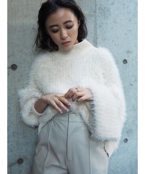 もこもこのファンシーヤーンとフェザーの糸を組み合わせたニットトップス。ボリュームのある素材感が目を引く一枚です。襟や袖口などのリブには光沢感のある素材を使用し、エッジを効かせています。【お取り扱い上の注意】素材の性質上 毛羽が抜けることがあります。<モール糸使用品のお取扱い方法>モール糸自身が太く、組織も粗くなる為、糸が浮いたり、引っ掛けたりすることがありますので、取扱いには、次の点に十分ご注意ください。●着用時、ベルト・バッグや周囲の壁等との摩擦や引っ掛かりにご注意してください。●クリーニングの際は、クリーニング店へ、モール糸の為、他の商品との引っ掛かりに注意していただく様、ご提示ください。●万一、糸が浮き出た時は、その部分を中央にして、両手で生地をタテ、ヨコ、斜めに引っぱり、出た糸を少しずつ引っ込めるか、裏側に引っぱり出してください。