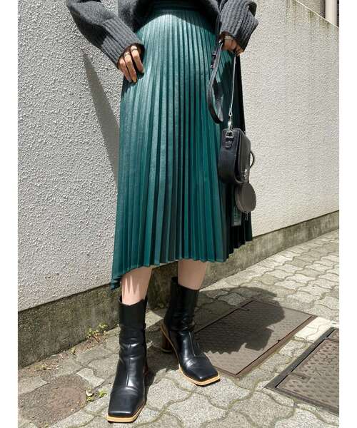 フェイクレザーにアコーディオンプリーツを施したミディ丈スカートです。裾はアシンメトリーになっており、歩くたびに揺れるヘムラインが動きがあってきれいなデザインとなっています。
