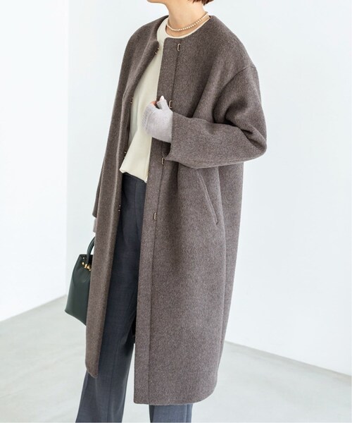 【2021AW】IENAIENAの名品アウター、ラムウールノーカラーコートが今年も登場!ラムウール100%の滑らかで上質な手触りと上質な光沢感、しっかりと詰まった素材をベースに起毛加工をかけて肉厚の膨らみ感にこだわり、丁寧に作りこんでいる国産の別注素材です。昨年初登場して人気となった美しく深みのあるシックなメランジチャコールグレーは継続し、今シーズンは新色のナチュラルとピンクを作りました。デザインは長く支持をいただいているシンプルなノーカラー。ややドロップしたショルダーやコクーン気味のシルエットなどトレンドを程よく取り入れながらもベーシックに着回しできるコートです。前あきはミニマルで高級感のあるホックを使用し、デザインポイントに。上質素材の繊細な起毛加工により美しい毛並みを作っています。着用アフターケア(ブラッシング)をしていただくことで、より長く美しい状態を保ちます。ロング丈とハーフ丈の2型で、ディティールは共通です。こちらのロング丈は、膝までの着丈で暖かく着用いただけます。シリーズもございます。ラムウールノーカラーコート(品番21020900542030)**********************透け感:なし裏地:あり伸縮性:なし光沢感:なし生地の厚さ:厚手**********************【スタッフ着用コメント】《hareko》年齢:30代前半/身長:165cm/体型:細身/普段サイズ:S~M/着用サイズ:38サイズ感:袖丈は手の甲に少しかかるくらい。着丈は膝下で、すねが見えるくらいの長さになりました。袖や身頃には程良いゆとりがあって、真冬でもきちんと着込めるサイズ感。素材感:ほんのり起毛させたような、ふんわりとした表面。滑らかな手触りで、ずっと撫でていたくなるような素材です。着心地:ハンガーにかけた状態で持つと少々重たく感じますが、羽織った際に重たさはあまり感じませんでした。スタッフ愛用率も高い、IENA自慢のコートです。(わたしも色違いで3着持っています!)《スタッフB》年齢:30代後半/身長:155cm/体型:普通/普段サイズ:S/着用サイズ:38サイズ感:ややゆとりがあり、膝が隠れる着丈です。ロングですが重たい長さではなかったです。素材感:やや厚みのあるふっくらとしたイエナでは定番のラムウール。滑らかで上質、とても軽いです。着用感:長さはありますが重さが全く気にならないです。冬もしっかり着れるコートです。**********************※取り扱いについては、商品についている品質表示でご確認ください。※こちらの商品は、IENAでの取り扱いになります。直接店舗へお問い合わせの際はIENA店舗へお願い致します。※商品の色味は、撮影場所や光のあたり具合などにより色味が違って見える場合が御座います 。また、お客様のお使いのPCのモニター環境などにより色味が違って見える場合が御座います。予めご了承の上ご注文下さい。グレー着用スタッフ身長:164cm 着用サイズ:38ナチュラル着用スタッフ身長:164cm 着用サイズ:38ピンク着用スタッフ身長:165cm 着用サイズ:38詳細着用スタッフ身長:165cm 着用サイズ:38VMID:586226435
