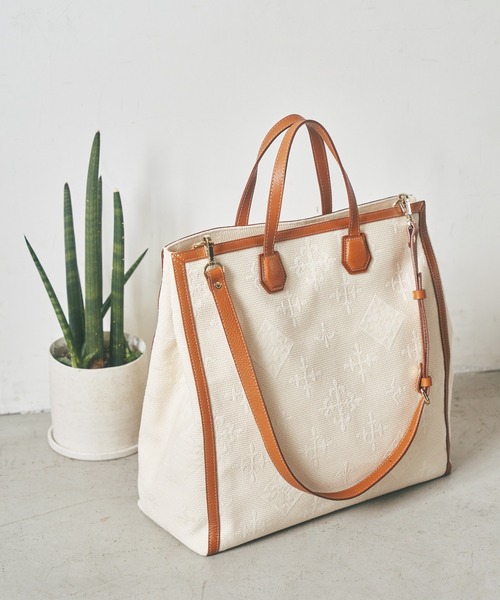 1針1針糸 を刺し模様を作り出す、日本に古くからある伝統手芸の「刺子」。その模様が出るように織った綿織物の刺子織を使用しています。糸の凹凸がしっかり出るところが特長の生地をベースに、モノグラム柄を合わせました。一件無地の綿生地ですが、よく見ると動きがある生地になっています。荷物の多い方におすすめなビッグショッパートートの形でご用意しました。ざくざくと荷物を収納し、ラフなスタイルに合わせていただくのもおすすめです。ショルダーベルトが付属しており、2WAYでお楽しみいただけます。現代では道着に使われている素材ということもあり、丈夫で厚みがあり、形が崩れにくいところもポイント。さらに取り外し可能な底板もついています。キナリのカラーに相性のいいキャメルのレザーを合わせ、1年中コーディネートに取り入れられる、ナチュラルな印象に仕上げました。<ポケット>内装ポケット:オープンポケット×1、ファスナーポケット×1【注意点】・生地の風合い上、糸くずや黒い点が入っております。予めご了承ください。・直射日光を長時間受けますと変色の恐れがあります。・保管の際には他のものと接触させないようにしてください。移染が起こる可能性があります。【保証期間:お買い上げ日より6ヶ月間】本サイトにてご購入の品については納品書をもって保証書に代えさせて頂きます。セール品の修理につきましては原則有料とさせて頂きます。予めご了承下さい。▼お気に入り登録をおすすめしています・商品のお気に入り登録:完売カラーの再入荷通知・在庫数1点の通知・セール通知を受け取れます。・ブランドのお気に入り登録:新作商品や再入荷などのブランドの情報を受け取れます。