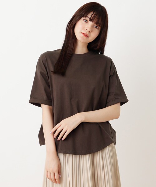【デザイン】裾がラウンドデザインになったTシャツです。着丈もあり、リラックスした雰囲気が今年らしいです。シンプルですが、お袖をクルンと折り返したデザインがポイントになっています。【生地感】柔らかい風合いで肌触りが良く、素肌に触れても心地いいコットン(綿)100%素材です。※ナチュラル(050)はやや透け感があるため、インナーの着用をおすすめします。【サイズ】大きいサイズ(LL)の展開あり。※04(LL)サイズはWEB限定サイズです。モデル情報:身長168cm B75 W60 H87 着用サイズ:02(M)店舗へのお問い合わせ商品番号:741-13329●製品寸法:02(M):着丈66cm B112cm 袖丈19cm 肩幅54cm03(L):着丈69cm B119cm 袖丈21cm 肩幅56cm04(LL):着丈71cm B126cm 袖丈22cm 肩幅58cm備考: