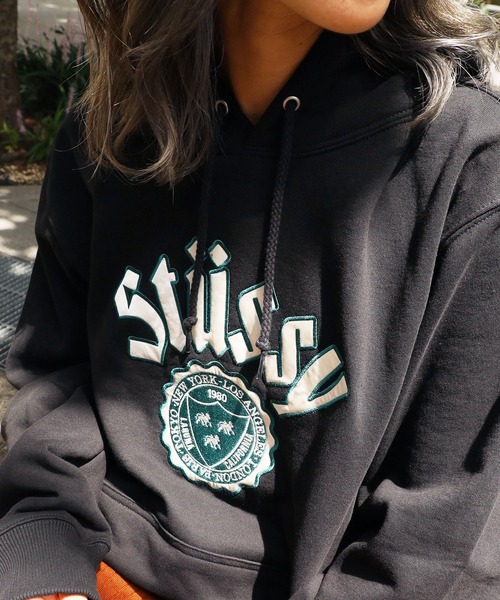 STUSSY/ステューシーから、CITY SEAL APP.HOODIEが新入荷! 西洋のエンブレムがモチーフのフーディーパーカー。 STUSSYロゴは、サテン生地を採用し刺繡で縁取っているこだわりのあるデザインになっています。 フードと、カンガルーポケットが大き目で、男女で着ても様になるシルエット。 裏起毛なので保温性もGOODです☆ 女性の方は、オーバーサイズチョイスで一枚で着てもかわいいです♪ ダボっとしたボトムスの、カーゴパンツやスウェットパンツ、デニムなど様々なボトムと相性抜群です。 スタッフコメント:女性スタッフ、男性スタッフ共に人気のあったアイテムです! 今年の秋冬に大活躍。 【STUSSY】 ステューシー(STUSSY)とは、1982年にカリフォルニアでサーフボードのシェイパーだったショーン・ステューシー氏が設立したスケーター・ブランド。設立当社は友人にオリジナルのTシャツを作成していた程度だったが、彼の店はスケーターたちの集まる有名店になっていく。1985年にはEZ(イージー)パンツやドクロのプリントシャツが話題を呼び、1991年頃にスラッシャー・ブームに乗って大ブレイクした。また一方で、デザインにはラップミュージックから生まれたアイデア「サンプリング」手法をいち早く取り入れ、DJやラッパー、ハードコアパンクなどのミュージシャンたちに愛用されクラブシーンのマストアイテムとしての地位も確立していった。いまやストリート系ブランドのカリスマ的存在になっており、後の「裏原宿カルチャー」にも多大な影響を与えたことでも有名である。