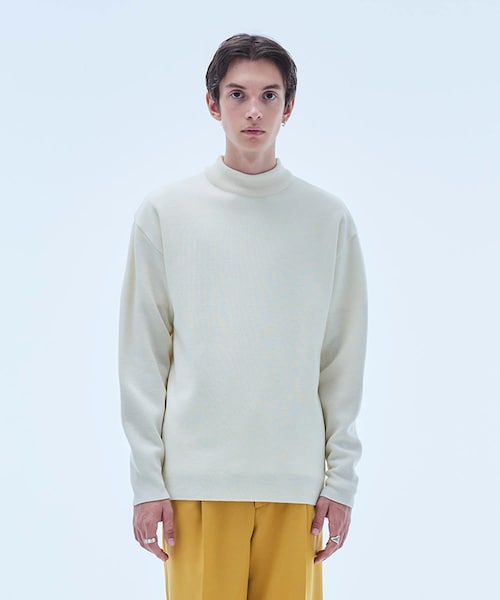 ◆素材バルキーヤーン(ふっくらとしていてかさの高い糸)を使用したモックネックニット。軽く膨らみの有るバルキー糸を12G(ゲージ)のミラノリブ組織で編み上げ、高級感のある柔らかい素材にしています。形態安定性に優れた素材なので、手洗いも可能な点も嬉しいポイントです。◆デザインシルエットはウエストの絞りのないややゆったりとしたボックス型でトレンドのモックネック。アクリルをメインにしているため、夏以外の時期であれば着用でき、長い期間活躍してくれます。モックネックのデザインは、タートルネックが苦手という方でも抵抗な