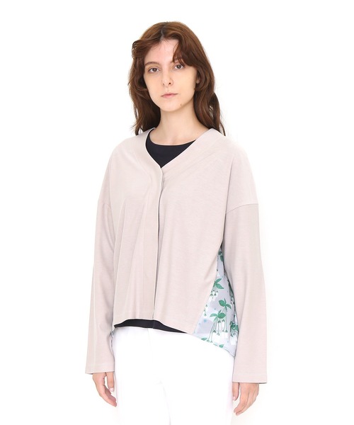 ツツジ科の植物「ベニドウダン」を描いたグラフィックデザイン。たくさんの鐘型の花が咲き誇る、優しい印象のデザインです。バックに透け感のある布帛素材を使用したボタンあきカーディガン。※商品画像と実物では多少色味に違いがある場合がございますので予めご了承下さい。※発売日や販売状況は店舗によって異なります。