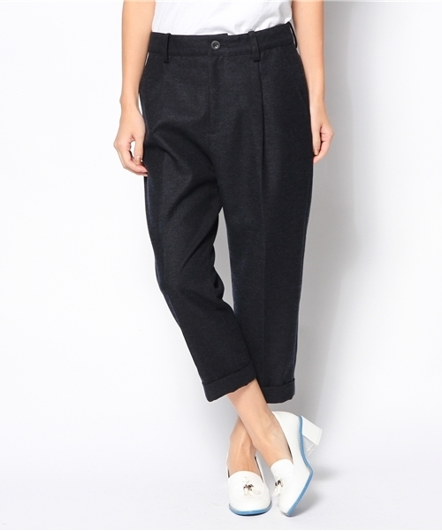 【 nota della mano sinistra 】色目に特徴のあるカジュアルめの起毛素材のパンツをセンタープレスのマニッシュなパンツに落としこみました♪ きちんと感とカジュアル感のあるアイテムです。 【nota della mano sinistra (ノータ・デラ・マノ・シニストラ) : シンプルだけどちょっと個性のあるデザイン。きちんときれいに自分らしく。でも肩の力は抜けたお洋服です。】 modelH160 B82 W62 H87 着用サイズ:2