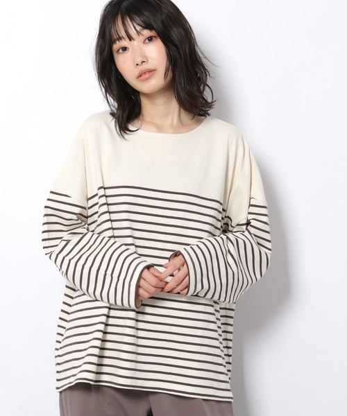 ベーシックなアイテムを、あえてオーバーサイズに仕上げたボーダー柄Tシャツ。1枚でも雰囲気のあるシルエットがポイントです。ネックラインは、ほどよい開き具合のボートネックで、すっきりとした印象に。ロングシーズンお使いいただけるバスクTシャツです。【素材】ドライでざっくりとした風合いが特徴の、コットン100%素材を使用。【スタイリング】ラフにデニムに合わせても、ロングスカートに合わせても女性らしく着こなせます。ボトムスにインでもアウトでも、お好みでスタイリング可能な1枚です。