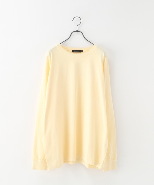 ーーー ピグメント加工を施した古着のようなヴィンテージ感のあるロンT。 リメイク感や加工感を出す為に、後ろ身頃を接ぎ(ハギ)にしているので一枚でもサマになるアイテムです。 リラックス感のあるゆったりとしたビッグシルエットで、今年らしくオーバーサイズで着ていただけます。 ーーー 身頃はコットン100%なので、秋から春にかけて長いシーズンで着用していただけます。 カジュアルなスタイリングはもちろん、スラックスやスキニーパンツで合わせたキレイ目なコーディネートにも相性の良い一着です。 加工はカジュアルになり過ぎないようにキレイめな表面感に仕上がってます。 長く着こみながら徐々に変化する生地感も楽しんでいただけるポイントです。