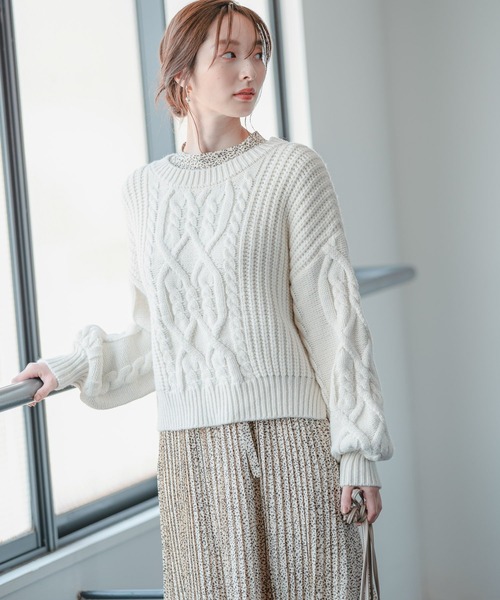 カジュアルに女らしくざっくりと編んだケーブルニット。 身体が泳ぐややオーバーシルエットで、ショート丈。 スカートに合うベストバランスにこだわり、女性らしい印象に仕上げました。 フロント、バック、袖すべてにケーブルを入れているので全方位可愛い一枚。 サイドはスリット入りでもたつきもありません。 あえてウールを入れず、ニット特有の重みを軽減。肩の凝らない軽い着心地も魅力です。 【素材】 3ゲージケーブル編み 膨らみと弾力性があり、ケーブル柄も目立ちやすい素材。ウールが入っていないのでお手入れが簡単なところもポイントです。 ストレッチあり 透け感なし ーーーーーーーーーーーーーーーーーーーーーーー ▼ 商品のお気に入り登録 ▼ 完売カラーの再入荷通知や、ラスト1点の通知、 セールの通知も受け取ることができます。 ▼ ブランドのお気に入り登録 ▼ 新商品や再入荷など、 ブランドのお得な情報をいち早くお知らせ! ぜひご登録ください! ※屋内外の光や照明の当たり具合で、実際の商品の色味とカラー別画像の色味に違いが発生する場合がございます。 色味はスタジオ撮影の詳細画像にてご確認ください。 ※生地の寄り画像が最も実物に近い色味となります。