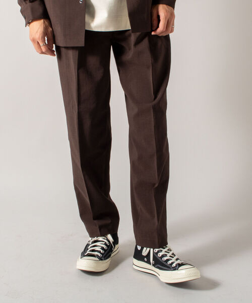 大人気”EVALET素材”を使用したイージーパンツ。 サラッとした速乾性が特徴で、広めの渡りから裾にかけてのテーパードシルエットで綺麗に着用していただけるデザインです。 ドローコードは内側に出すこともできる仕様なので、ベルトを着用したい方にも嬉しいポイントです。 ※同素材のオープンカラーシャツ(品番:1-0091-5-51-101)とセットアップでの着用もおすすめです。 ~EVALET(エバレット)とは~ エバレットは、優れた吸水性を持つ肌触りが快適な吸汗・速乾素材です。 ポリエステル素材のため、水切れがよく、室内外を問わず素早く乾きます。 【生地感】 -------------------------- 透け感:なし 裏地:なし 伸縮性:適度にあり 光沢感:なし 生地の厚さ:やや薄手 -------------------------- 【スタッフ着用コメント】 身長:170cm/体重:52kg/体型:細身/普段サイズ:M/着用サイズ:M タックが入ってすっきりしたシルエットなので、シャツをサラっと合わせてレザーシューズや カーディガンと合わせたり、キレイめカジュアルにおすすめです。 ★★★ Gloster(グロスター) ワーク/ミリタリー/ヴィンテージをベースにその時代にあったエッセンスをミックスさせ、 パターン、品質、縫製、着心地を大切にしながらベーシックだけどシルエットや細部のディテールにこだわった遊び心のあるアイテムを提案しています。 ※お取扱い上のご注意 アテンションタグを必ずご確認の上、着用又はお取り扱いください。 ※店頭及び屋外での撮影画像は、光の当たり具合で色味が違って見える場合があります。 ※商品画像に関しては出来る限り忠実に表示出来るよう努めておりますが、お客様がご利用のモニターの設定及び特性により、実際の商品と比較し色味に若干の誤差が生じる場合があります。 ◇商品のお気に入り登録◇ 【お気に入りに登録】を是非ご活用ください。 再入荷の通知や、ラスト1点の通知、セールの通知がいち早く届きます。 ◇ブランドのお気に入り登録◇ 新商品や再入荷など、いち早くブランドのお得情報が届きます。