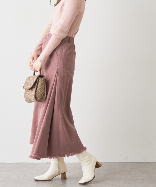 【2021AW natural couture】 シルエットにこだわった大人ガーリーな1品◎ 裾フリンジスカート ■Design 両サイドに切り替えしの生地を施し、女性らしい柔らかいフレアラインを実現しました。 さりげない裾のフリンジ使いが、軽やかな雰囲気もプラスし、コーデの幅が広がる1着。 ウエストの後ろ部分はゴム仕様でストレスフリーな着用感も魅力です。 ■Styling デザイン性のあるスカートにはシンプルなTシャツや、袖にディテールのあるブラウス、 素材感の異なるトップスを合わせるとお洒落感がアップします。 これからの時期、ざっくりとしたゆるっとニットをウエストアウトしたり、 スッキリめのハイネックをウエストインしてスタイリッシュに仕上げたり、雰囲気の違うコーデも楽しんで頂けます。 パンプスやスニーカーはもちろん、ショートブーツも相性の良いミディ丈でお作りしました。 ■Fabric 普段使いしやすい生地感で、オールシーズンお召し頂けます。 カラーは、定番で合わせやすいベージュ、インディゴブルーと、 今季も注目のピンクを加えた全3色展開でご用意しました。 =============== 透け感:ほとんどなし 裏地:なし 伸縮性:なし 光沢感:なし 生地感 :身体馴染みの良い生地感 ===============