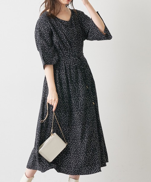 【2021AW natural couture】 エレガントなフレアラインが魅力◎ウエストタックワンピース【WEB限定カラー:ドット】■Design 落ち感のある生地を採用し、裾にかけての緩やかなフレアラインが動く度に女性らしい揺れ感を演出してくれます。フロントのウエストは切り替えを作らず、タックを施したことで美しいシルエットを実現しました。袖部分にはさりげなくスリットを加え、気になる腕周りを華奢に見せつつヘルシーな肌見せで軽やかな雰囲気に◎ウエストの後ろ部分はゴム仕様で、着脱も楽にして頂けます。更に、前後ろお好みで結んで頂ける付属のウエストリボンに加え、バックスタイルの金ボタン部分には取外し可能なリボンを施し、その日の気分やシーンで雰囲気を変えてお召し頂けます。■Styling 1枚でさらっと着て頂くのはもちろん、シンプルなデザインなのでネックレスや小物でアクセントをつけて頂くと雰囲気を変えて楽しんで頂けます。程よいリラックス感ときちんと感の両方が叶うデザインで、普段使いやお出かけなど幅広いシーンで活躍する事間違いなしの1着です。■Fabric さらっとして着心地の良いポリエステル素材を採用。ご自宅でのお手入れも楽にして頂けて、コーデに悩む日でもさっと着れてスタイリングが決まるので、色違いで持っていたくなる1品です。===============透け感:柄1と柄2はややあり裏地:なし伸縮性:なし光沢感:なし生地感 :さらっとした生地感===============【お気に入り登録でお得な情報がいっぱい】・「商品のお気に入り登録」で再入荷通知や、ラスト1点の通知、セール通知をいち早く受け取ることができます。・「ブランドのお気に入り登録」で新商品や再入荷など、お得な情報を受け取ることができます!