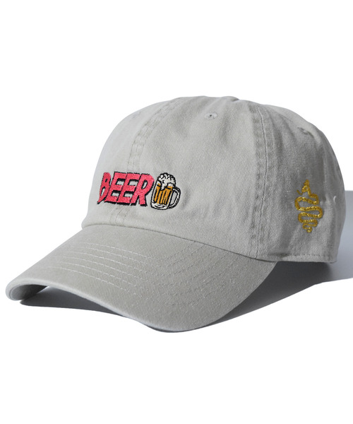 ALDIES独自のセンスを感じさせるアートワークからピックアップしたビールモチーフを刺繍であしらったキャップです。 バックル付きのアジャスターベルトが付属しており幅広いサイズ調節が可能で、シーズンレスに着用可能なコットンツイル製となっています。 クラウンが浅めですっきりとしたフィットの被り心地はコーディネートに取り入れやすく、アクセント使いにも便利なアイテムです。