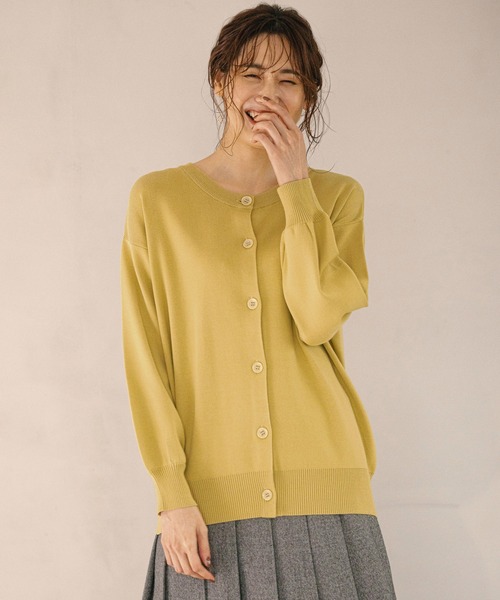 シンプルデザインのクルーカーデ 長く着用していただきやすいさらっとした質感の素材と、 抜け感のあるサイズ感がポイントのシンプルなクルーカーディガンです。 同色系のインナーとアンサンブルスタイルで着用したり、ボタンを一部だけ あけたプルオーバーとして着用するスタイルもおすすめ。 マシンウォッシャブル対応なのでご自宅でのお手入れがしやすいのもポイント!