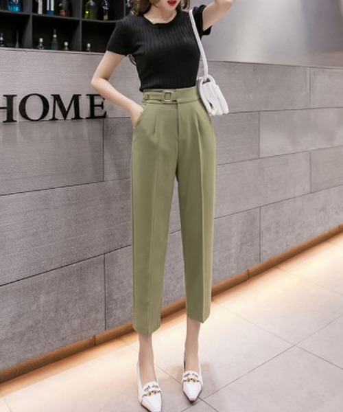 ベルトデザインがアクセントの一本 【デザイン・シルエット】 センタープレスを効かせているため、すっきりとした脚長ラインを演出します。 足首が見える丈なので着回ししやすいです。 付属ベルトでウエストマークができ、トップスインもエレガントに決まります。 【カラー】 合わせやすいベーシックな三色展開です。 【おすすめのスタイリング】 キレイ目なアイテムと合わせたキレイ目スタイルからカジュアルなTシャツ合わせまでどんなアイテムにも合わせやすくオススメです。