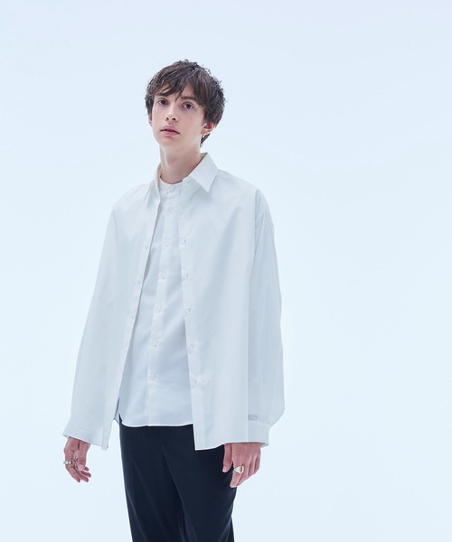 ◆素材 反発性のあるコットンタイプライター素材。 生地加工を施し、パカパカした質感が特徴。 通常の綿100%のシャツ地に比べ、シワにもなりづらく、 肌触りも滑らかな上質なクオリティー。 ◆デザイン 程良くゆったりとしたボディーバランスに、袖にボリュームを出したシルエット。 ステッチを表に出さないモダンでシンプルなディテールに袖には肘タックや深めの袖口タック、アジャスト釦などで着方に応じて、袖にポイントを置いたニューシルエット。 同月のベストとのレイヤードがオススメスタイリング。