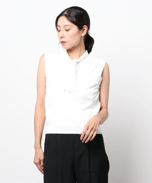 CELFORDのCを使ってモノグラムの図案を起こしました。 柔らかい糸の風合いを生かす天竺に、アイレットで表現しています。 上品に見え、何にでも合わせやすい大きさと柄を組み合わせて作っています。 ボディの形は程よいサイズ感のノースリーブで、肩巾は少し多い目にしているので二の腕あたりをきれいにカバーしてくれます。 衿は総針で編み、衿周りは半分に折り返し、端に向かって自然に開いた状態で1回結びをして着用してください。 結びの位置はお好みで多少調節ができます。 身頃は程よいゆとりがあり、ボトムにインしてもアウトしても良い丈に設定してます。
