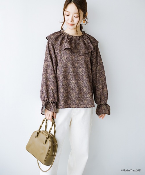 アートをまとって乙女心にキュンをチャージ! うっかり寝坊した朝も、華やぎたい日にも、かわいい柄のお洋服があればサクッとテンションアップできちゃいます♡。そして柄物のブラウスがあれば、あとは楽しても大丈夫なのが便利なところ!(楽してるとはバレますまい。)ということで、とことんかわいく、乙女心をぐっとつかむブラウスを作りました!アール・ヌーヴォー様式の巨匠ミュシャの美しい図案をプリントしてできたブラウス、今年こそ食欲の秋ではなく芸術の秋を楽しめそうです。でも念のため、体型カバーもそっとできるようにしときました♡ 〈サイズ感〉 普段フリーサイズをお選びの方は、MサイズかLサイズがおすすめです。 〈デザイン〉 「スラヴィア相互保険銀行の保険証券」に描かれた繊細なモチーフを基にオリジナルプリントしたとっておきです。1枚でパッとテンションの上がるデザインに!と、顔まわりにフリルをあしらいました。それでいて、甘くなりすぎないようにギャザーは少なめに。フリルの丈も長めなので、ふんわりボリュームが出すぎることなく大人っぽい雰囲気です。着心地は窮屈にならず、ニットなどを重ねたときもモゴモゴしないほどよいサイズ感を追求!さっと気軽に着られる身幅に設定しています。ボトムスを選ばず着られるように、インしてもしなくても可愛く着られる丈にしてすっきりと。袖はキャンディスリーブにしてかわいげをプラスしました♡。 〈素材〉 つるりとした肌触りで、軽い着心地のポリエステル素材。ほどよいハリがあるのでフリルが上品にきれいなシルエットになります。透け感はないので気軽に着られるのも魅力です。 〈カラー〉 鮮やかすぎず暗すぎず、ルンとするブルーに、赤みのあるブラウンとやわらかいベージュを組み合わせた<ブルー系その他>と、まろやかなブラウンにくすんだグリーンとダークブラウンを組み合わせてまとめた<ブラウン系その他>の2色です。 〈コーディネート〉 ブラウスが華やかなので、いつものデニムを合わせるだけでパッと着映えます。着慣れたシンプルなパンツやロングスカートにインして合わせればたちまち新鮮に♡。サロペットやニットを上から着て、衿をふんわり見せるのも今っぽくてかわいいです。 〈Mucha(ミュシャ)〉 チェコ出身のアルフォンス・マリア・ミュシャ。アール・ヌーヴォーを代表する画家で、ポスターやインテリア、彫刻など多くの作品を生み出しました。ミュシャの最大の魅力は、美しい曲線を多用したデザイン力。「線の魔術師」と呼ばれたほどの、太い輪郭線と繊細な装飾性が織りなすロマンチックな美しさに、ひとめでハッとします。 ※手洗い可 #ブラウス #大きいサイズ #Sサイズ ========== haco! とは =========== ファッションアイテムを軸に、毎日の生活がちょっと楽しくなるようなお洋服をお届けしています。 毎日が、そして明日が、昨日よりちょっとびっくりできる、 そんなお洋服や雑貨、プロジェクトがたっぷりつまったツーハンサイトです。 ===========================