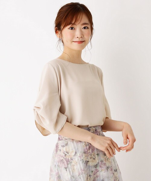 【デザイン】 袖のタック使いでニュアンスたっぷりに仕上げたブラウス。 二の腕をカバーする五分袖のデザインもうれしいポイントです。 ボトムアウトでもバランス良く着こなせる後ろ長めのヘムライン。 【生地感】 残暑のシーズンも快適なサラリとしたジョーゼットを使っています。 こちらの商品は主に秋に着用いただける商品です。 モデル情報:身長166cm B83 W58 H85 着用サイズ:00 店舗へのお問い合わせ商品番号:P93-53507 ●製品寸法: 00:着丈57cm B110cm 袖丈30cm 肩幅36cm 備考: