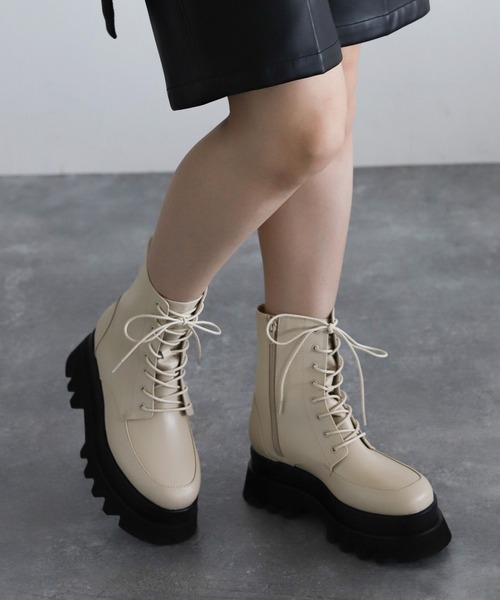 ーーー 去年大人気だったコンバットブーツがバージョンアップして登場! ボリュームソール×コンバットブーツで、モードな印象に仕上げました。 ーーー つま先のフォルムと、ソールの厚みのバランスが今年らしく、 パンツスタイルでもスカートスタイルでもきまるアイテムに。 サイドジップで、着脱しやすいのもポイント。 柔らかい生地感で作成しているため、ブーツ特有の足首周りの窮屈感もなく着用可能です。 ソールの高さを出しているため、自然に盛れるアイテムですが、 高低差を付けていないため歩きやすいのも◎ ボリューム感のあるアイテムながらも、 長時間履いても疲れにくいストレスフリーなアイテムです。 クールなパンツスタイルにはもちろん、スカートやワンピースなどに合わせて 使用すれば今年らしいスタイリングにきまりおすすめです。 ※撮影環境により、光の当たり具合で 色味が違って見える場合があります。 あらかじめご了承下さい。