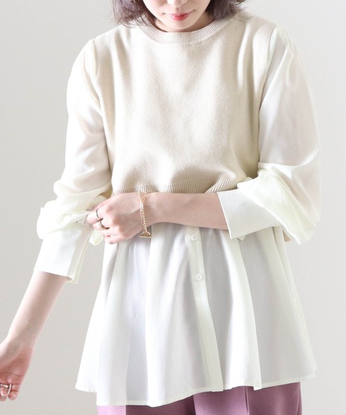 ブラウスとベストのレイヤードでこなれ感のあるスタイルに セットアイテムなのでこれ1枚で決まるのがうれしい◎ ■point ・別々でも着ることができるブラウスとベストのセット ・シアー感と揺れ感がこの時期から使いやすい万能ブラウス ・うれしいチュニック丈でスタイルアップが叶う! ■detail まだまだ注目したいセットアイテム シンプルなベストとシンプルなチュニックブラウスは レイヤードして着るのはもちろん、別々で着るのもかわいいデザイン! 少しだけ凹凸感のあるブラウスは、 汗ばむ夏でもべたつかず肌触りがいいのもうれしい ■coordinate 甘めがお好きな方にはショートパンツとブーツで秋らしいコーディネートがかわいい♪ ヒップラインが隠れるチュニック丈はセミフレアパンツと合わせて大人なスタイリングもおすすめ! ブラウスは生地感がかわいいので、単体で着るときはデニムなどシンプルなアイテムでも◎ ベストは編み柄もなくシンプルなのでワンピースなどとレイヤードするのもかわいいです ■素材・洗濯 素材:【ベスト】アクリル 45% / 綿 37% / ナイロン 15% / ポリウレタン 3%【ブラウス】ポリエステル 100% 洗濯:洗濯可(手洗い) ********** 透け感…あり(ブラウス) 裏地…なし 伸縮性…あり(ニットベスト) 光沢感…なし 生地の厚さ…やや薄い ********** ※撮影場所やお使いのモニター環境により若干お色味が異なる場合がございます。 ■商品のお気に入り登録■ ラスト1点の通知やセール通知、また完売していても再入荷時に再入荷通知を受け取ることができますので、是非ご登録ください♪ ■ブランドのお気に入り登録■ 新商品や再入荷など、お得な情報を受け取ることができます!ぜひご活用ください!