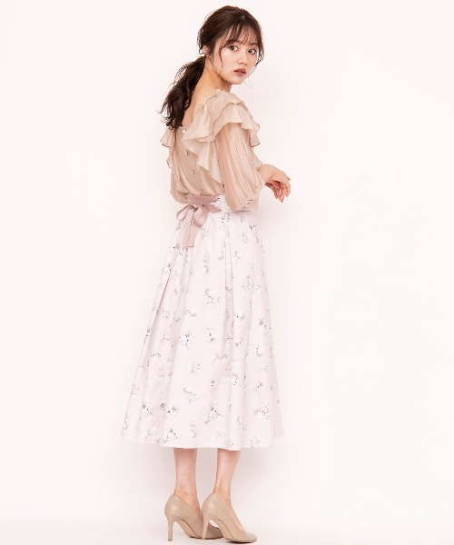 繊細なタッチが魅力のラインフラワーシリーズ♪【デザインpoint】・水彩画調のラインポピー柄が品よく愛らしいスカート。・ハイウエスト&バックレースアップでレディにスタイルアップ♪・グログランリボンのさりげない配色もポイント。・タック入りのフレアシルエットでふんわりフェミニンです♪・ウエストバックゴム仕様。サイドジップ式。【素材】・優しいカラーがきれいに表現された、パウダリーな表面感のポリエステル素材。・適度なハリ感のある、軽い穿き心地の生地です。・肌触りスムースな裏地付き。【スタイリング】「パフスリーブタックブラウス」とのコーディネートでクチュール感のあるフェミニンスタイルに。柔らかなシフォンブラウスを合わせてふんわりまとめるのもおすすめ♪【care】ドライクリーニングM:(02):着丈81cm/ウエスト62~cm/ウエスト縦幅8cm
