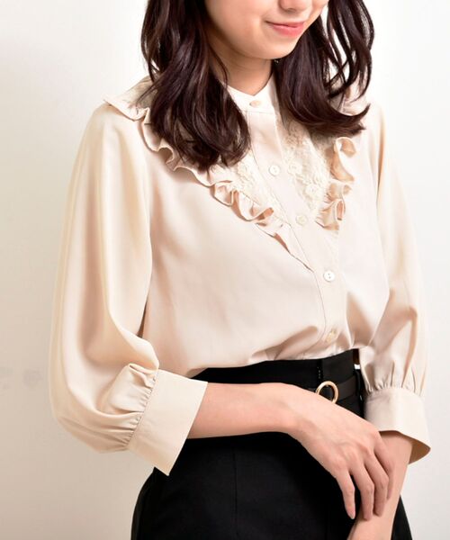 てろんとした滑らかな素材で仕上げられ、クラシカルムード高まるブラウスが登場しました♪フロントに施された繊細なレースやフリルが、コーディネートにアクセントを添えてくれそう!合わせるボトムスによって印象が変わるので、オンオフ問わず着まわしが効く優秀アイテムです◎