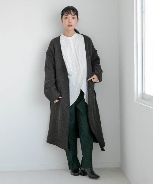◆素材もっちりとしたメランジ素材をピリングがしにくいように後加工をしています。◆デザインアウターのように羽織れるロング丈のニットカーディガン。 衿端、裾、袖口等に配色のハンドステッチ風の刺繍を施しました。パッチポケットをボタンレスにすることでアウターのように仕上げてます。◆スタイリングカラーのカットタートルを入れてセミワイドパンツやワイドパンツでゆるっと着る着方が今年らしくておすすめです。タックロングチュニックなどのチチュニック丈×ロングブーツの合わせもかわいいです◎