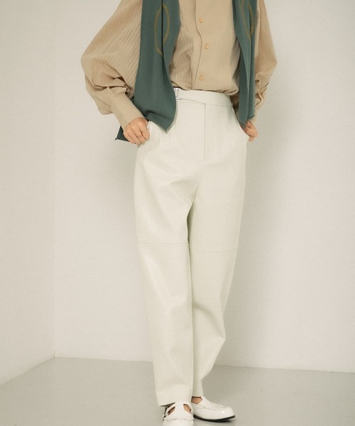 【コーデを格上げしてくれるフェイクレザーパンツ】 引き続き注目のフェイクレザーパンツは、取り入れるだけで旬な着こなしが叶うアイテム。フロントベルトでウエスト調整でき、裾にかけて細くさせた丸みのあるシルエットは美脚効果抜群。ソフトな穿き心地も嬉しいポイント。 同素材のフェイクレザーベスト(KC16-27V230)もございます。 POINT ・艶感のあるフェイクレザー生地を使用 ・程良くボリュームを持たせた丸みのあるシルエット ・肌触りの良い、ソフトな穿き心地 COORDINATE レザー特有の存在感があるので、ベーシックなカットソーやニットを合わせるだけでサマになります。シャツやベストでモードにまとめるのも◎ ※この商品は、素材の特性上、着用の経過と共に徐々に劣化します。 ※高温多湿を避け、陽の当たらない風通しの良い場所で保管してください。 ※その他お取り扱いに関しましては、商品に付属のアテンションタグをご覧ください。 ※商品画像は、光の当たり具合やパソコンなどの閲覧環境により、実際の色味と異なって見える場合がございます。予めご了承ください。 ※商品の色味の目安は、商品単体の画像をご参照ください。 ▼お気に入り登録のおすすめ▼ お気に入り登録商品は、マイページにて現在の価格情報や在庫状況の確認が可能です。 お買い物リストの管理に是非ご利用下さい。 ----------------------------- 透け感:なし 伸縮性:ややあり 裏地:なし 光沢:あり ポケット:あり -----------------------------
