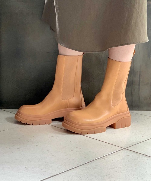 ボリュームソールのチェルシーブーツ。スクエアトゥにぽってりとしたフォルムのトレンドライクなデザインは、足元に取り入れるだけでコーデを今年らしくアップデートしてくれます。 シンプルなサイドゴアデザインはASHらしくディティールにこだわったデザインに仕上がりました。 ラグソールのような凹凸のあるソールはボリューム感をプラスしてくれ、足元をすらりと見せてくれそう◎ 秋冬のボリューミーなコートやジャケットスタイルの足元にもピッタリ。 パンツインでクールに、スカートやワンピースのハズシアイテムとして合わせていただくのもおすすめです。 ■ソール、つま先、かかと部分にはヴィンテージ加工が施されております。 ■ 天然皮革の為、色むらや軽微な傷、押された痕、または生前からの傷、筋、しわ等が残っていることが通常です。これらは全て革製品の特性ですので予めご了承下さい。