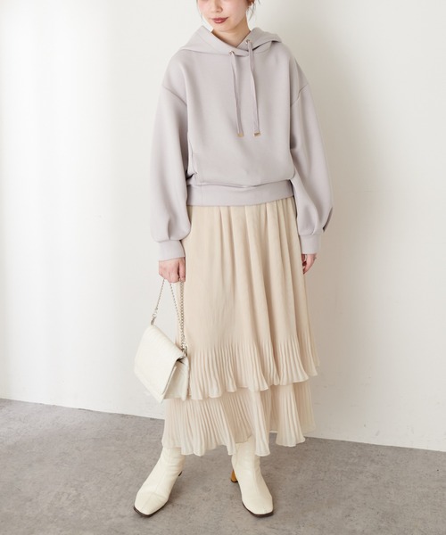 【2021AW natural couture】 柔らかな品のあるプリーツ使いが目を引く◎ ティアード消しプリーツスカート ■Design トレンド感と女性らしさの両方をコーデにプラスしてくれる、今季注目のアイテムが登場です。 繊細でさりげないプリーツを施した生地と重ねたデザインに仕上げ、 シンプルなトップスと合わせるだけでもお洒落上級者コーデが完成します。 柔らかく揺れる生地感と、絶妙なミディ丈が女性らしさをアップしてくれる1品。 ■Styling ゆるっとしたニットをウエストアウトしたり、スウェットなどの異素材合わせは、 スカートのデザインが引き立ち、いつものコーデに大人レディ要素がプラスされます。 キャミソールやハイネックインナーをウエストインして、ニットカーデを羽織っても◎ ■Fabric さらっとして柔らかなポリエステル素材を使用し、ストレスフリーな履き心地を 実現しました。 シーズン問わずお手持ちのアイテムと合わせて楽しんで頂けます。 ================ 透け感:ほとんどなし 裏地:あり 伸縮性:なし 光沢感:なし 生地感 :さらっとした生地感 ================ 【お気に入り登録でお得な情報がいっぱい】 ・「商品のお気に入り登録」で再入荷通知や、ラスト1点の通知、セール通知をいち早く受け取ることができます。 ・「ブランドのお気に入り登録」で新商品や再入荷など、お得な情報を受け取ることができます!