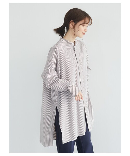 比翼仕立てで洗練感のあるミニマルなデザインに仕上げたシャツワンピース。 ゆったりとしたドロップショルダーがこなれ感を演出。裾の両サイドにスリットを入れることで、軽やかなシルエットに仕上げました。 パンツやスカートとレイヤードしたり、前ボタンを開けて羽織ったりと、様々なコーディネートも楽しめるアイテムです。