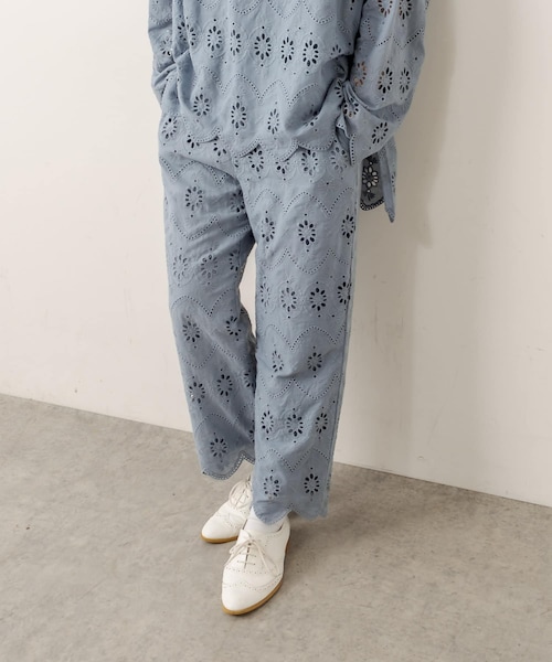 ピュアルセシン 2021 autumn&winter collection【sophisticated retro】洗練されたレトロな雰囲気を新しく取り込みながら、幸福感ある生き方を求め安らぎや優しさをテーマに装い心地よいリラックスしたスタイリング。引き続き環境に優しいサステナブルでありながら、丸みを帯びたフォルムやフラッフィーな素材感で体を包み込んだ柔らかなスタイルの提案。◇大人の女性でも可愛く穿ける、ほんのり甘めのレースパンツ◇裾のスカラップレースと繊細なカットワーク刺繍が目を惹くパンツ。メイン地と同色の刺繍なので、甘くなりすぎず、デイリーに活躍してくれます。ウエストはゴム仕様で、ヒップから太ももにかけてゆったりしています。裾に向けてほんのりテーパードをかけているため、横に広がり過ぎることなくスッキリした印象に。トレンドのブルーカラーを加えた3色展開。女性らしい柔らかさと、ほんのり甘さをコーディネートにプラスしてくれる1枚です。・スカラップレースでこなれた抜け感を演出・1枚でコーディネートをフェミニンにしてくれるカットワーク刺繍・脚のラインを隠してくれるゆったりシルエット・お腹周りはゆったり、足首にかけて程よく締まるテーパード型・定番のグレージュ・ブラックにトレンドのブルーを加えた全3色展開・同素材のブラウス(No.241310120)とのセットアップもおすすめ・ウエスト丈のトップス合わせは勿論、チュニックやワンピースなど丈の長いアイテムからチラッと覗かせるのも可愛くきまる・透け感を感じない、丁度良い厚みの生地・安心の裏地付き===============================透け感:なし裏地:あり伸縮性:なし光沢感:なし生地の厚さ:普通【スタッフコメント】年齢:20代前半/身長:157cm/普段着用サイズ:Mサイズサイズ感:ウエストが総ゴムなので着脱しやすく、楽に着用していただけるサイズ感。素材感:とても柔らかく履き心地の良い肌あたりです。幅広い体型の方に着用していただけます。===============================※撮影場所やお使いのモニター環境により若干お色味が異なる場合がございます。特にロケの撮影では明るく見える傾向にございます。※予約商品はサンプルで撮影をしております。若干の仕様が変更になる場合がございますので予めご了承の上ご注文くださいますようお願いいたします。