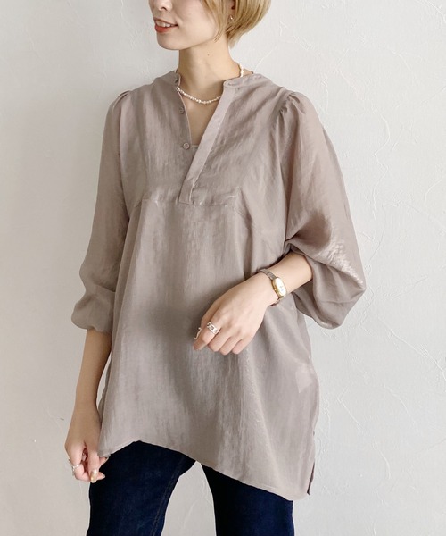 程よいシャイニー感が上品な印象の2WAYブラウス。 チュニック丈なのでボトムを選ばず合わせやすい一着です。 ■point ・ほんのりキラキラして見える素材で高見え感◎ ・存在感のあるボリューム袖がポイント ・ボタンは前でも背中でも着られるので、雰囲気を変えて楽しめます ■styling シアーな軽やか素材なので、今季トレンドのベスト合わせがおすすめ! チュニック丈で腰回りもカバーしてくれるので、パンツの時はそのままアウトで スカートの時はインして着こなし方を変えてみても◎ 【INFORMATION】 ■商品のお気に入り登録 完売していても再入荷時に再入荷通知を受け取ることができますので、是非ご登録ください! ■ブランドのお気に入り登録 新商品や再入荷などの情報を受け取ることができますので、是非ご登録ください! ※撮影環境により、光の当たり具合で色味が違って見える場合があります。あらかじめご了承ください。