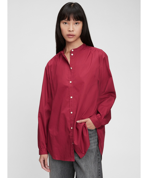 滑らかなポプリン生地 長袖 前ボタン、バンドカラーシャツ シャーリング入りバックデザイン ラウンドヘム ストレートシルエット、リラックスフィット 腰丈 *商品タグに記載の価格とサイト上の販売価格が異なる事があります。