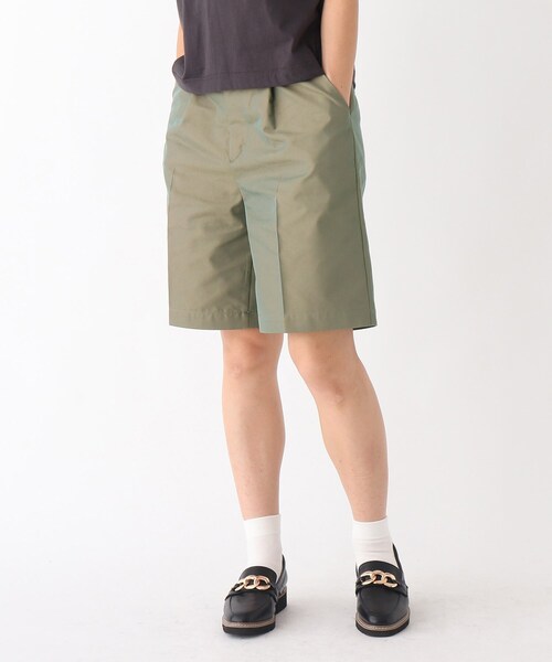 コットンポリエステル素材を使用したワンタックショートパンツ【素材】コットンポリエステルのツイル組織のファブリックを採用。程よいハリのあるマシンウォッシャブル機能が付いた1枚。※裏地なし【デザイン】着丈は大人っぽく着られる膝が少しだけ隠れる丈に設定。大人の品をキープしながら無理せず挑戦できるハーフパンツです。センタープレスのキレイめ素材なので、お手持ちのアイテムとの相性〇です。フロントに1タックを入れているので、日常の動きにも対応可能。見る角度によって色が変わって見える玉虫カラー(427カラー)とソリッドでプレーンなブラック(019カラー)の2色展開。秋まで着られる素材感なので、ブーツ合わせも楽しめます。メンズライクな着こなしはもちろん、フェミニンなトップスにも好相性。※ポケット数:横×2、後ろ×2こちらの商品は主に秋に着用いただける商品です。モデル情報:身長165cm B84 W62 H89 着用サイズ:38(M)店舗へのお問い合わせ商品番号:C12-63011●製品寸法:36(S):W60~62cm H84cm 股下21cm 前股上33cm 渡り幅31cm 裾幅29cm38(M):W62~64cm H88cm 股下22cm 前股上33cm 渡り幅33cm 裾幅29cm備考: