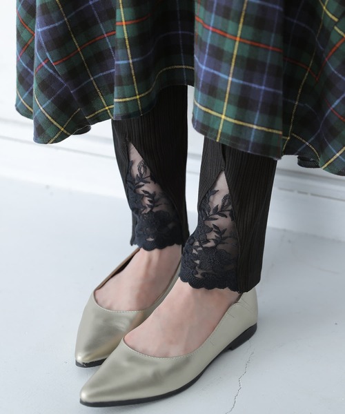 裾から覗かせるだけで可愛さが生まれる異素材リブレギンス。 センターメロウから切り替えた繊細なスカラップレースが足元にニュアンスをプラス。 肌に張り付きにくいカットソー素材です。 ≪n'OrLABEL≫フロントレースリブレギンスです。