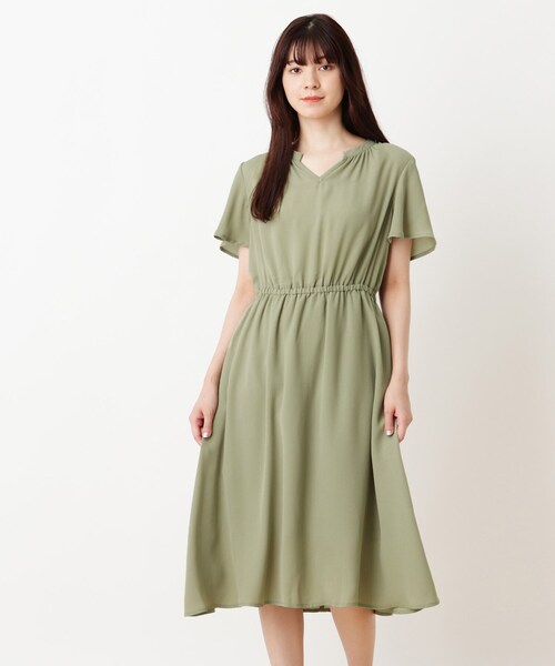 【デザイン】夏にぴったりなきれいめキーネックワンピース。ウエストゴムは締め付けすぎず程よくブラウジングできる仕様です。全体的にすっきりシルエットですが、体のラインを拾わないデザインで、歩くたびに揺れるニュアンスが女性らしい印象にみせてくれる、大人女子にぴったりな楽ちん美ラインワンピです。※ポケットなし【生地感】合繊の落ち感のある素材感で、軽い着心地です。※スカート部分のみ裏地ありモデル情報:身長168cm B75 W60 H87 着用サイズ:02(M)店舗へのお問い合わせ商品番号:741-53015●製品寸法:02(M):着丈107cm B84cm 袖丈21cm 肩幅38cm W68~86cm H100cm03(L):着丈108cm B92cm 袖丈22cm 肩幅38cm W72~90cm H104cm04(LL):着丈108cm B100cm 袖丈22cm 肩幅38cm W76~94cm H108cm備考: