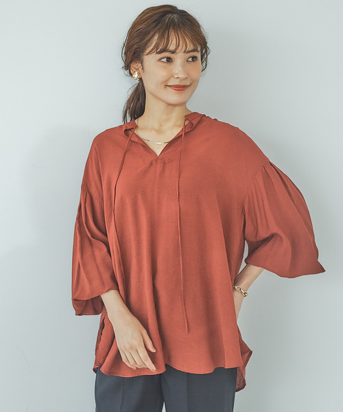 ボリューム袖がレディでおしゃれな秋冬ブラウスほんのりシアー素材が軽い見た目のボリューム袖ブラウス。袖をたくし上げたときのほわっと膨らむシルエットがなんとも可愛い!前後2way仕様なので気分によって変えていただけるのが嬉しいポイント。リボンを前にしてフェミニンに、後ろにして後ろにしてスタンドカラーで着ていただくとクールな印象にも。秋冬に使いやすいブラックとベージュ、季節感満載のボルドーもおすすめです!異素材のスカートでオフスタイルはもちろん、きれいめパンツにインしてオフィスでも着ていただけます。